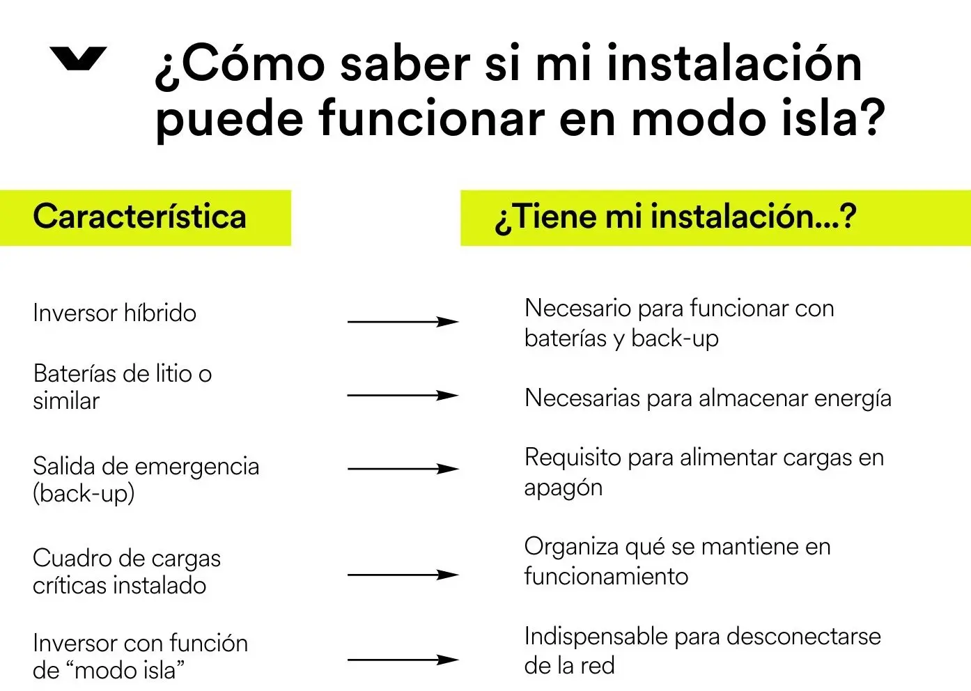 Necesitas un inversor que tenga capacidad de crear una red eléctrica “aislada” (modo isla) en tu vivienda, de forma que, aunque se corte el suministro general, pueda seguir alimentando algunos circuitos de tu hogar con la energía almacenada en tus baterías o la que generes en ese momento con las placas.